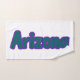 This custom hand towel features a design that displays the word "Arizona" in a Boldoa print font and purple coloured letters turquoise outline in this custom state pride jersey style theme. This towel is made with a polyester blend front while the back is 100% cotton all towels will use sublimation/vibrant printing which is designed to last.