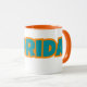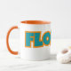 This custom coffee mug features a design that displays the word "Florida" in a Luckiest Guy print font with aqua coloured letters orange coloured outline in this custom state pride jersey style theme. The rim & handle are glazed in matching colours available in 11-ounce or 15-ounce sizes microwave and dishwasher safe ceramic construction.