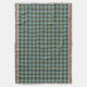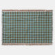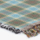 Throw blanket with the official state tartan of Michigan. Traditional plaid pattern in shades of light blue, tan and green, with red and white highlights.