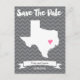 State of Texas map art save the date postcard. White text and state of Texas silhouette on a charcoal grey chevron background.