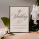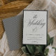 STATELY Calligraphy, modern wedding invitation. Template features, classic black typography and stripe pattern backing with soft ecru color backgrounds.