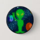 An alien making the peace sign with his hand. Out in space, l with planets, and stars behind him. One of the planets is Earth. static