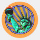 In this fun and patriotic pop art inspired design, the Statue of Liberty gazes out over New York City. Lady Liberty and her crown rise from a blue circle with blue & yellow stripes jetting up from behind. Her torch rises above in bold red flames. Show your love for New York City or the Statue of Liberty with the Statue of Liberty Emblem graphic.