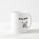This print for a mug features a minimalist design with the encouraging phrase “Stay positive” and a simple line drawing of an atom or molecule, symbolising positivity at a microscopic level. The image is in black and white, giving it a clean and straightforward appearance. Centred in the middle is the phrase “Stay positive” written in a casual, friendly font. Just below the text, there’s a simplistic line drawing of an atom or molecule with electrons orbiting around it.