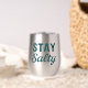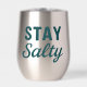 This 'Stay Salty' stainless tumbler features teal blue lightly distressed mixed vintage and modern fonts, creating a playful slogan. Whether you're salty from the sea breeze, or full of salty attitude, this graphic print stemless wine tumbler will show off your love for the beach.
