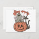 Charming Trio: At the forefront of this postcard, you'll find a super cute ghost perched atop a grinning jack-o' lantern, accompanied by a funny black cat. This trio of Halloween icons is sure to delight and enchant recipients.