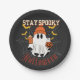 Bold ghost wearing an orange beanie with a jack-o-lantern bucket, set against spiderwebs and red Stay Spooky script—an energetic Halloween design for shirts and hoodies.