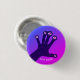 Stay weird psychedelic button with a trippy digital illustration of a dark palm with fingers ending in eyeballs with pink irises and strange white eyelashes watching you over purple background.