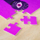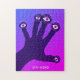 Stay weird psychedelic puzzle with a trippy digital illustration of a dark palm with fingers ending in eyeballs with pink irises and strange white eyelashes watching you over purple background.