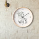 A unique black and white minimalist modern wall clock inspired by nature, featuring flowers sprouting from a woman's head to symbolise the connection between humans and nature. The clock includes a quote that reads 'Stay Wild' and roman numerals for the numbers. Perfect for nature lovers and those who appreciate modern art. Ideal for gifting on birthdays, Mother's Day, or to add a touch of nature to any room. Original design by Sierra Marquis.