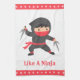 A cartoon of a stealthy ninja kid with a red veil preparing a combat pose with a pair of sai weapons. Text reads "Like a ninja" which you can personalise with own message or child's name. Great for boys who love the whole ninja shinobi martial arts genre.