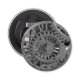 A photographic design of the wheels of a very early model of a steam train.