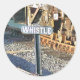 An art design of the sidings in an old steam railway yard showing the railway lines and goods train carriage wheels along with a sign showing "whistle".