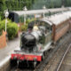 A beautifully restored steam train and carriages of a bygone era arriving at the train station. England UK.