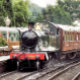 A beautifully restored steam train and carriages of a bygone era arriving at the train station.