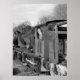 A black and white photographic design of old rusting steam trains awaiting restoration.