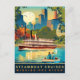 Mississippi river postcard. Steamboat is passing the small boat, with city skyline behind. Romantic travel postcard