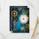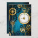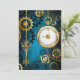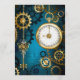 Turquoise, textured, steampunk background with brass and gold gears, a silver key and the clock. Steampunk style.