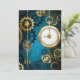 Turquoise, textured, steampunk background with brass and gold gears, a silver key and the clock. Steampunk style.