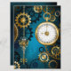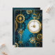 Turquoise, textured, steampunk background with brass and gold gears, a silver key and the clock. Steampunk style.