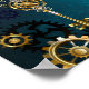 Turquoise, textured, steampunk background with brass and gold gears, a silver key and the clock. Steampunk style.