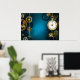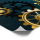 Turquoise, textured, steampunk background with brass and gold gears, a silver key and the clock. Steampunk style.