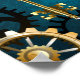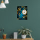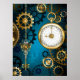 Turquoise, textured, steampunk background with brass and gold gears, a silver key and the clock. Steampunk style.