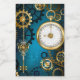 Turquoise, textured, steampunk background with brass and gold gears, a silver key and the clock. Steampunk style.