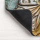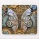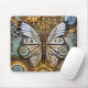 This is a steampunk styled mouse pad featuring a butterfly with vintage clocks and the inside gears of clocks in shades of light blue and brown.