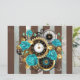 Patterned, antique watch, adorned with jewellery, gold hour hands and Latin numerals with turquoise roses on brown, striped background. Steampunk style.