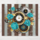Patterned, antique watch, adorned with jewellery, gold hour hands and Latin numerals with turquoise roses on brown, striped background. Steampunk style.