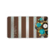 Patterned, antique watch, adorned with jewellery, gold hour hands and Latin numerals with turquoise roses on brown, striped background. Steampunk style.