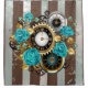 Patterned, antique watch, adorned with jewellery, gold hour hands and Latin numerals with turquoise roses on brown, striped background. Steampunk style.