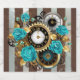 Patterned, antique watch, adorned with jewellery, gold hour hands and Latin numerals with turquoise roses on brown, striped background. Steampunk style.