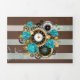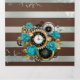 Patterned, antique watch, adorned with jewellery, gold hour hands and Latin numerals with turquoise roses on brown, striped background. Steampunk style.