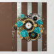 Patterned, antique watch, adorned with jewellery, gold hour hands and Latin numerals with turquoise roses on brown, striped background. Steampunk style.