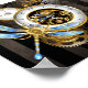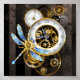 Antique dials with gold and brass gears, decorated with mechanical dragonfly on brown, striped background. Steampunk.