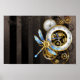 Antique dials with gold and brass gears, decorated with mechanical dragonfly on brown, striped background. Steampunk.