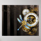 Antique dials with gold and brass gears, decorated with mechanical dragonfly on brown, striped background. Steampunk.