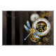 Antique dials with gold and brass gears, decorated with mechanical dragonfly on brown, striped background. Steampunk.
