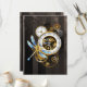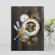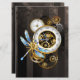 Antique dials with gold and brass gears, decorated with mechanical dragonfly on brown, striped background. Steampunk.