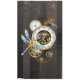 Antique dials with gold and brass gears, decorated with mechanical dragonfly on brown, striped background. Steampunk.