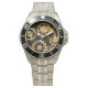 Has heft and feel of expensive stainless steel quartz watches. Good band with safety catch. I removed links, which is easy because engraved arrows show direction to push the linking pins. As always by this seller, the image (a railroad logo) is a perfect reproduction of my emailed image, and is precisely spaced and aligned.