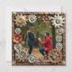 Romantic wedding Save the Date cards. Steampunk themed gold metal gears, copper, silver and gold flowers and a weathered rustic white distressed metal background. Upload your favourite picture in the personalise area and edit the text on the back to add your own wedding info.