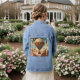 "Steampunk Cosmos: Ancient Marvels and Cosmic Technology" printed on a denim jacket features a mesmerising design that blends elements of steampunk, ancient civilisations, and cosmic technology. The intricate artwork showcases white steampunk hot air balloons with gears, Victorian-style ancient buildings, and archaeological ruins, evoking a sense of exploration and wonder. The rose gold cosmic background and cosmic flowers add a touch of celestial beauty to the composition, while the quantum steampunk gears in multicolored and iridescent light colours symbolise the technology of lost civilisations. Luminous dots represented by glowing circles with intricate patterns and symbols signify the decentralised nature of the blockchain network, adding a modern twist to the design. Inspired by the works of Gil Elvgren, Sachin Teng, Greg Rutkowski, and Alphonse Mucha, and influenced by David Lachapelle, this printed denim jacket is a stunning fusion of art, history, and technology, making it a unique and captivating addition to any fashion-forward wardrobe.