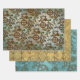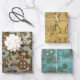 Wrapping paper sheets with steampunk designs. Three different colours and patterns cover these large sheets of gift wrap. Rusty gears over a distressed background, penny-farthing bicycles with big front wheels over sepia colour, and blue paper with old maps and various gears are the three designs. The paper is perfect for a birthday, graduation or any special event celebrating with an old-fashioned theme.
