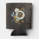 Antique dials with gold and brass gears, decorated with mechanical dragonfly on brown, striped background. Steampunk.