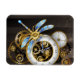 Antique dials with gold and brass gears, decorated with mechanical dragonfly on brown, striped background. Steampunk.
