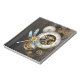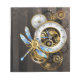 Antique dials with gold and brass gears, decorated with mechanical dragonfly on brown, striped background. Steampunk.