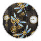 Antique dials and keys with gold and brass gears, decorated with mechanical, steampunk dragonflies on brown, striped background.
